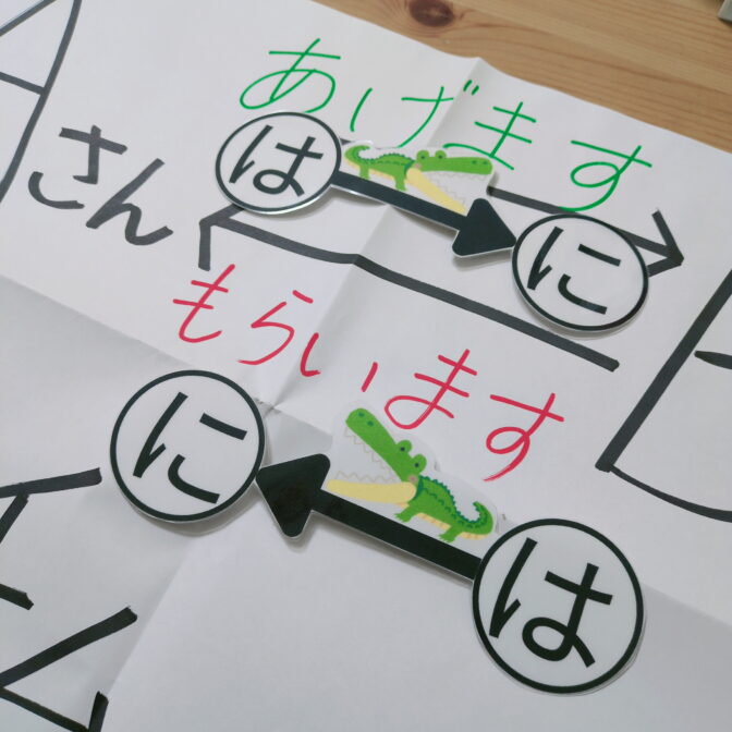 必ず、モノをあげる人には「は」、モノを受け取る人は「に」と、助詞を間違えることなく文章を組み立てることができます。 モノが動く方向と主語が異なるとき、反対の「はにはに矢印」を使います。反対の「はにはに矢印」はいつも「もらいます」になります。 「あげます」の反対も「くれます」の反対もです。 矢印が反対になっても「はにはに矢印」があると間違えずに作文ができます。